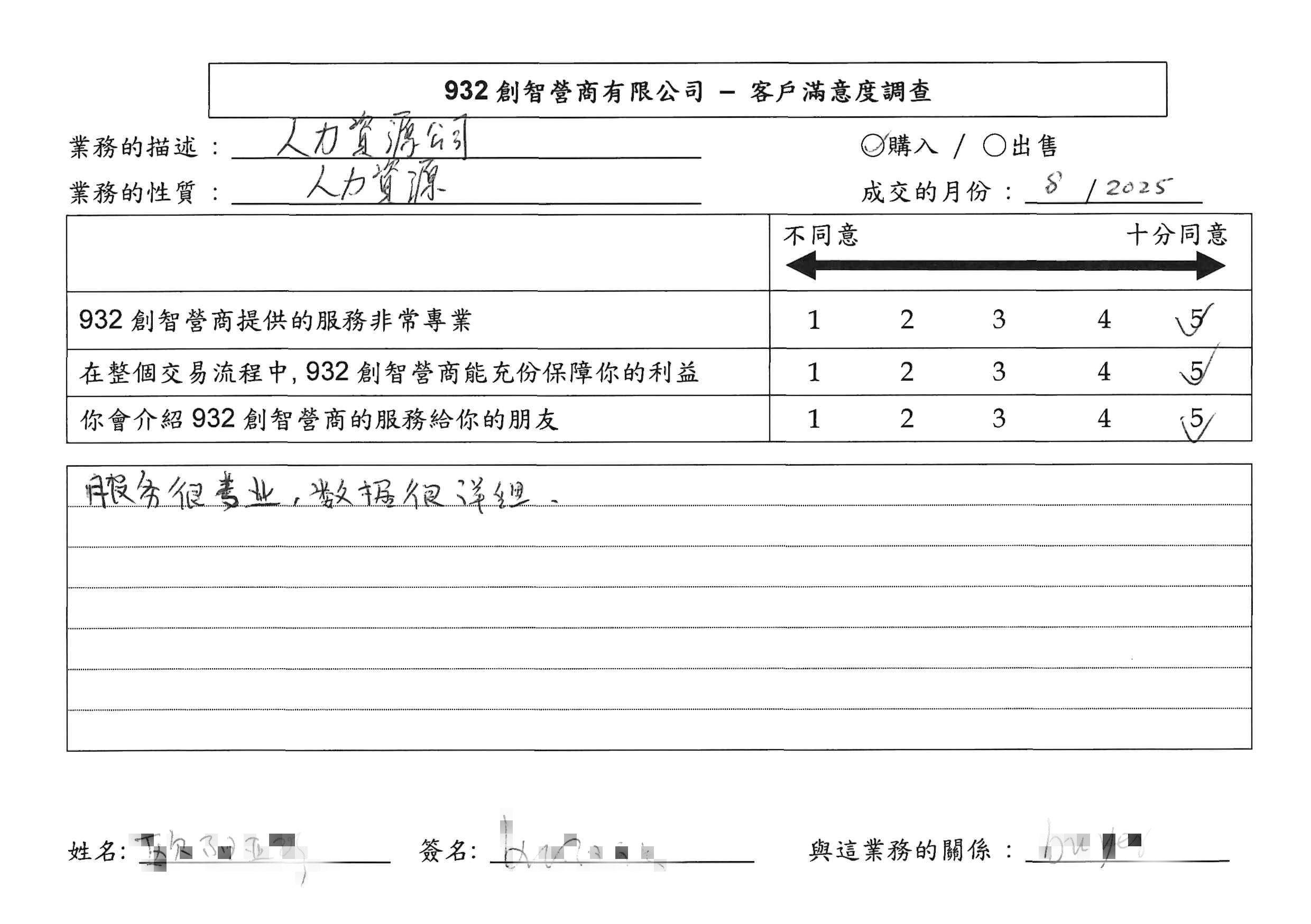在第二次見面便已成功交易,會向朋友,同行介紹 932 生意買賣。