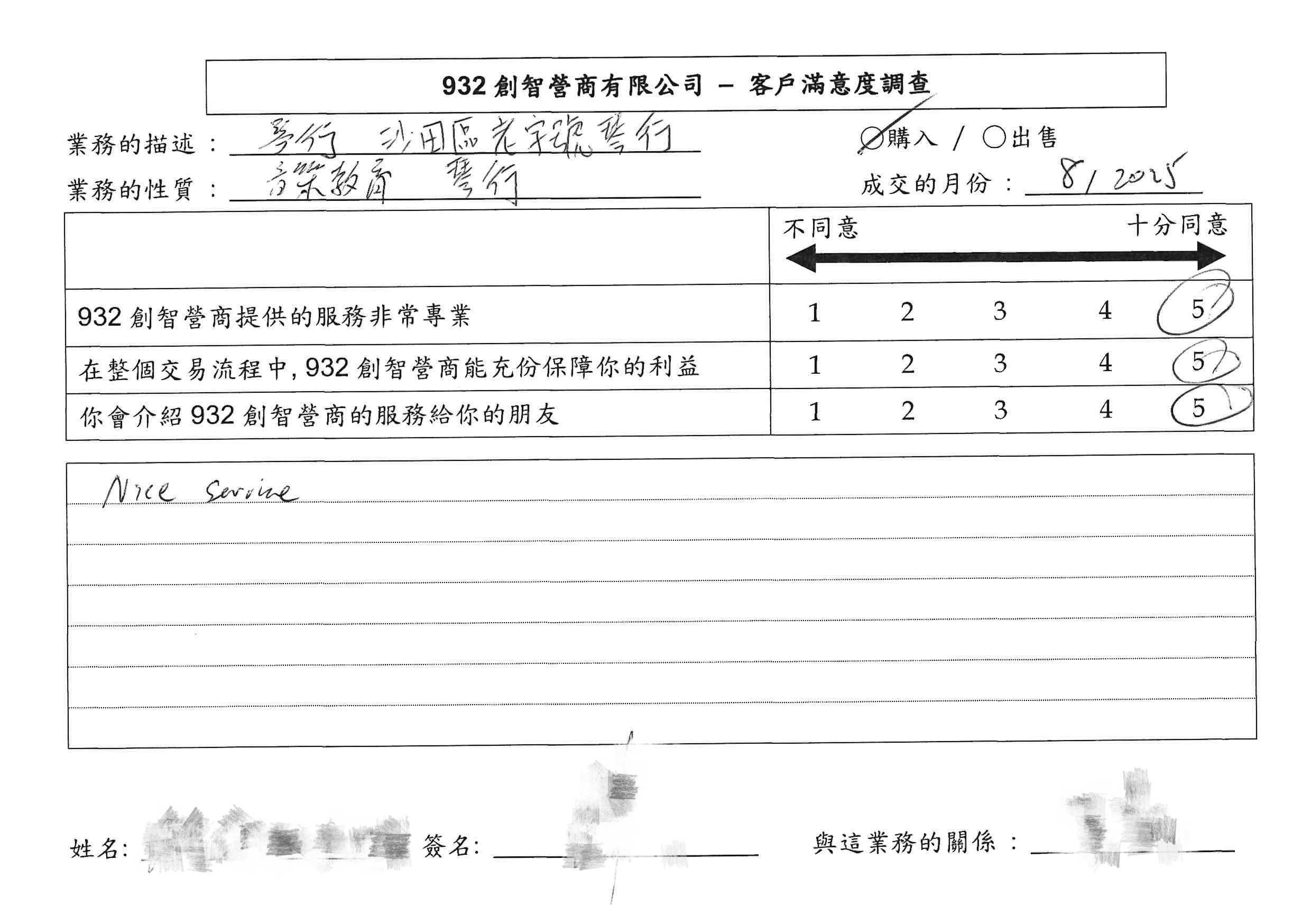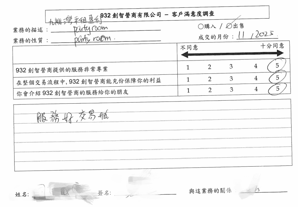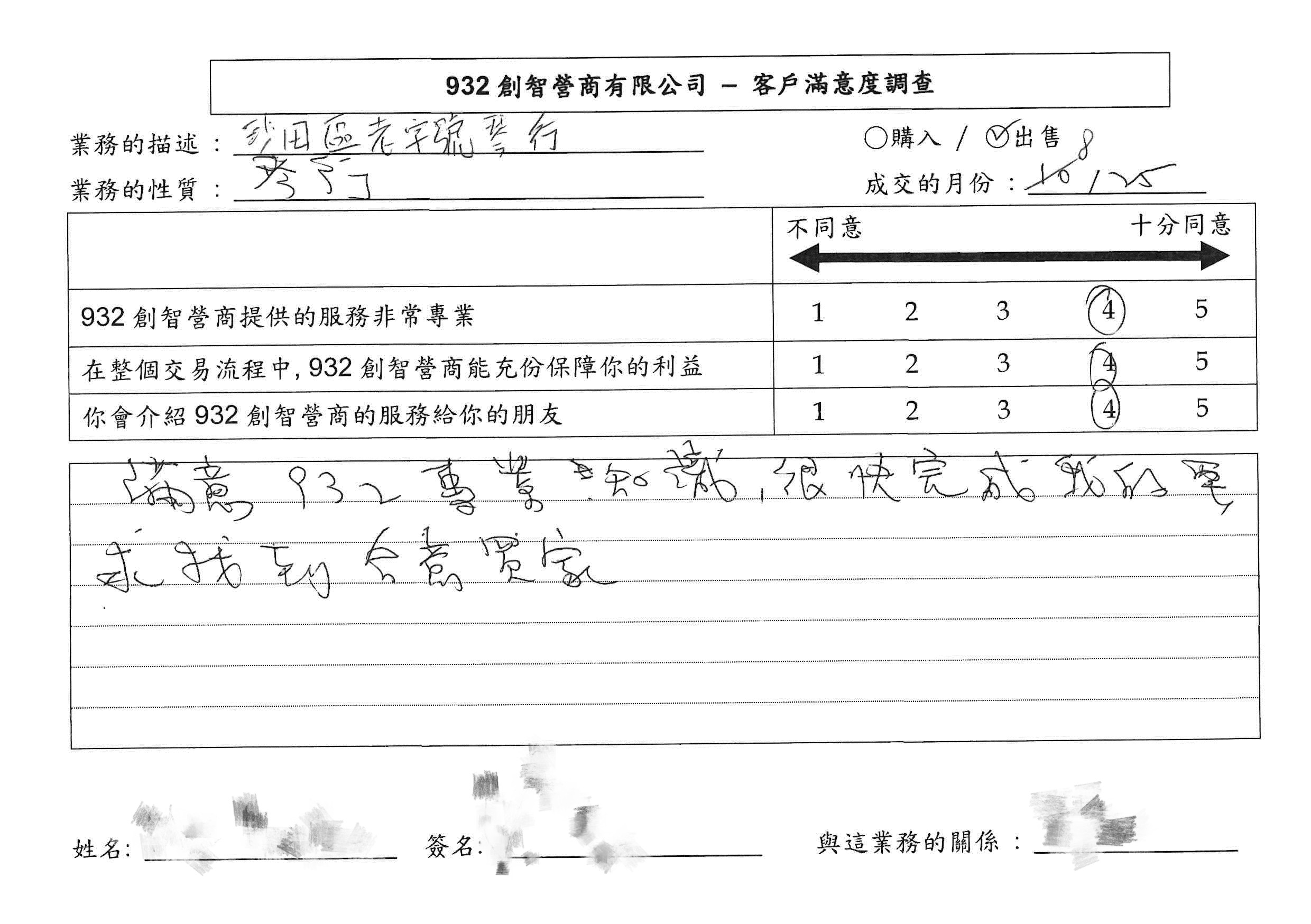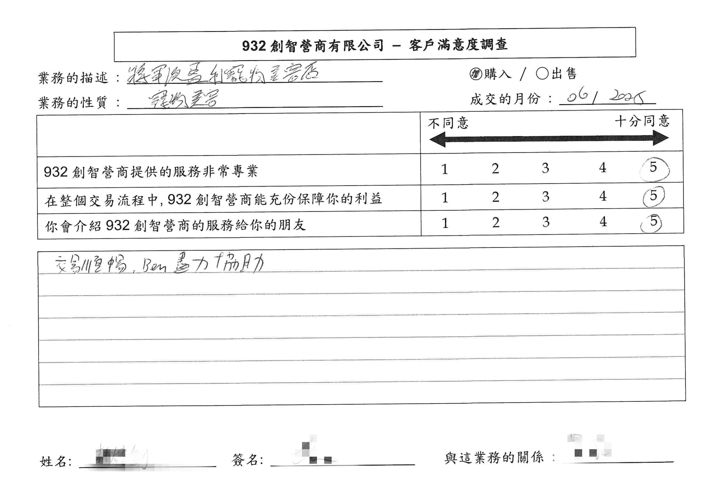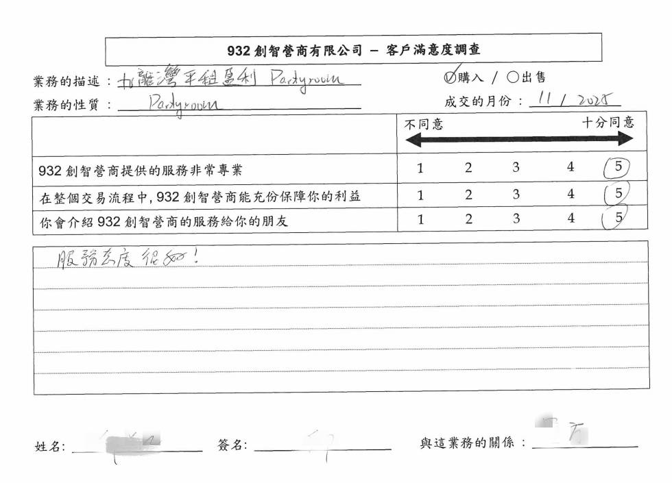 在買賣的過程中,何先生和施先生非常專業解答促成買賣,非常滿意932的服務,希望你們繼續提供優質服務
